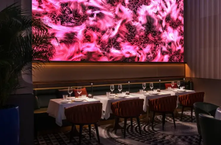As the architect for Zenon, Davide Algranti has created an experience that extends beyond the confines of a traditional restaurant. He has spent the vast majority of his career building restaurants in the Americas, Europe, Australia, and North Africa, and has gained a global perspective on design during those years that have been pivotal to the vision behind Zenon. Every single element of design, from lighting to layout, has been carefully crafted to create what he calls a “multi-sensory masterpiece” in this restaurant’s experience. The restaurant’s design combines a luxurious environment with artistic quality, creating spaces where high ceilings showcase the largest dynamic digital art pieces while allowing intimate seating arrangements.